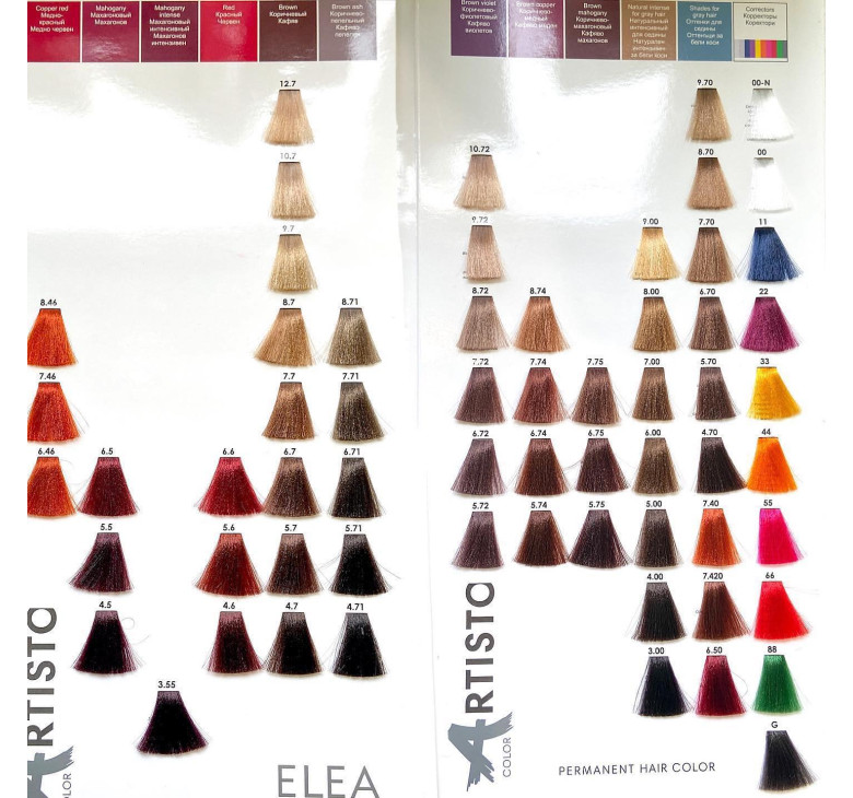 Elea Professional Artisto Color – крем-фарба болгарського виробника для стійкого фарбування та тонування волосся. Спеціально розроблена для професійного застосування та представлена великою кількістю відтінків, палітра складається з 96 кольорів. Всі відтінки мають насичений колір, 100% зафарбовує сивину, а також відмінно справляються з волоссям, яке погано піддається пігментуванню. Має м'яку дію, не сушить волосся і зберігає здоров'я волосся.