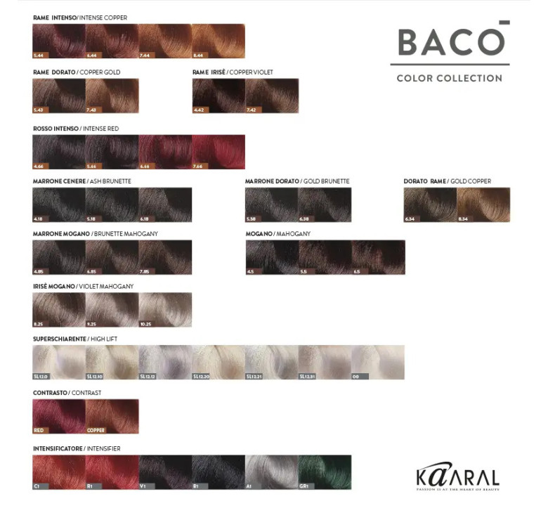 Барвник для волосся Baco Color Collection Kaaral повністю фарбує волосся, наповнює кольором волосся. Фарба зволожує локони, зміцнює їх, забезпечуючи стійкий, насичений і блискучий колір. Унікальна формула, заснована на технології Micro Pigment Technology, забезпечує стійке, рівномірне і насичене забарвлення. Завдяки мінімального розміру, молекули фарбувального пігменту з легкістю проникають в структуру волосся, надійно закріплюються в кортексі і дарують локонам яскравий сяючий колір.